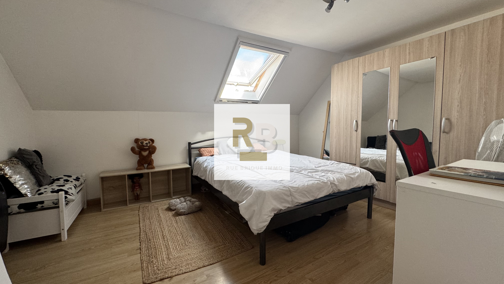 À l’étage, un palier distribue deux belles chambres ainsi qu’un accès aux combles aménagés, offrant un espace supplémentaire appréciable.